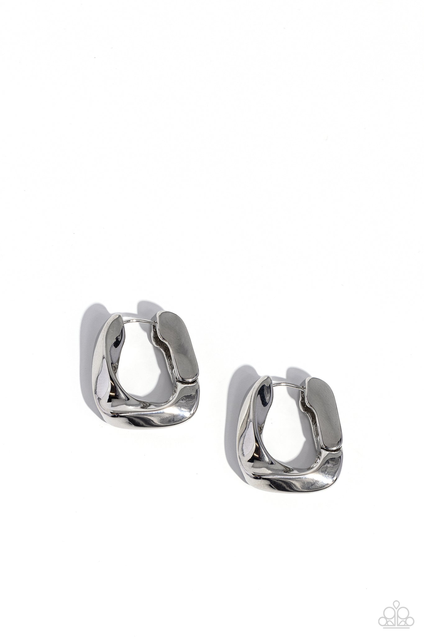 Featuring a beveled, asymmetric surface, a thick silver hoop snugly curls around the ear for a sleek basic look.